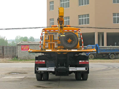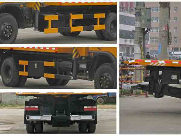 托舉質量:3800kg;裝備SQ5S起重機,自重1650Kg,起吊質量5000Kg;隨底盤選裝駕駛室, 防護材料:Q235A碳鋼,連接方式:左右側面防護裝置與大梁焊接連接;后部專用裝置與后防護干涉,, 故后防護豁免。 | ||