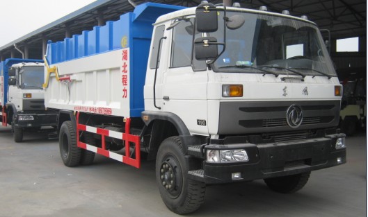 該車主要用于城鄉垃圾壓縮站的垃圾清運。垃圾壓縮站對垃圾進行收集、壓縮后將箱體垂直舉起,并打開壓縮箱排泄門,這時垃圾車箱體后門向上旋轉開啟,垃圾車后門與壓縮箱后門對接,之后垃圾塊被壓縮箱內的推板水平推進到垃圾車箱體內,完成垃圾裝載后關閉垃圾車后門,將垃圾運到垃圾處理地進行傾卸。該車由液壓控制系統來完成該車的后門的開啟和關閉及自卸功能,降低了工人的勞動強度和改善了工作環境。該垃圾車的收運方式是目前國內廣泛采用的垃圾壓縮站垃圾轉運方式,可以實現一車多站,大大降低了配備成本和空間等等;其專用裝置的功能均以汽車發動機為動力,通過液壓機構手動或電控、氣控來實現。車輛的箱體采用優質炭鋼板全密封焊接結構,具有強度高、重量輕,不產生二次污染等優點。