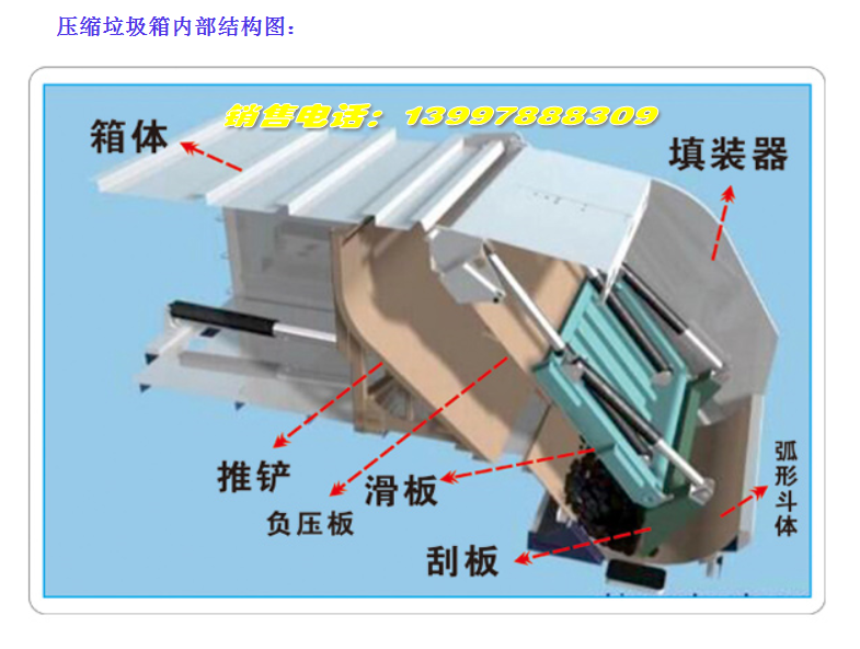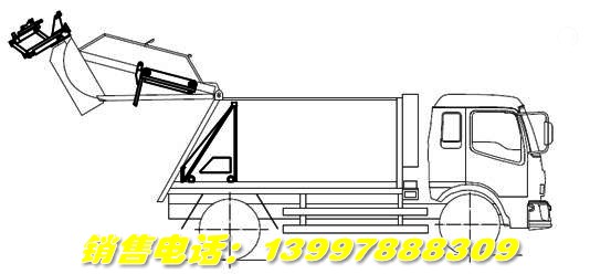 卸垃圾:則將垃圾斗體通過液壓裝置舉起,使用推鏟將垃圾推出,完成垃圾卸料。