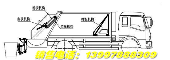 裝垃圾:壓縮垃圾車通過液壓翻轉(zhuǎn)機(jī)構(gòu)將垃圾裝人填裝器內(nèi),操作刮板,滑板沿弧型斗體將垃圾刮起,使用負(fù)壓將垃圾推進(jìn)垃圾箱內(nèi)。