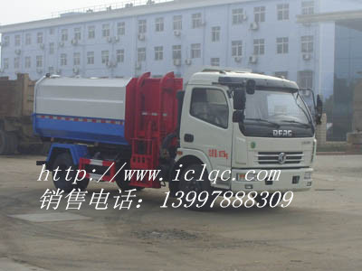 東風多利卡掛桶式垃圾車箱體裝置:為密封式結構,在箱體前部設有進料箱蓋,側面設有自裝料裝置,箱體后部設有卸料門。