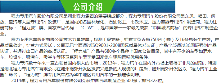 程力專用汽車股份有限公司(http://www.www.qufubbs.cn)國家知名園林綠化,市政環衛專用汽車制造廠家,專業生產:環衛垃圾車,多功能灑水車,吸污(糞)車,清障車等專用車系列,歡迎來電咨詢環衛垃圾車價格,灑水車價格等。銷售電話:13997888309 聯系人:戈經理