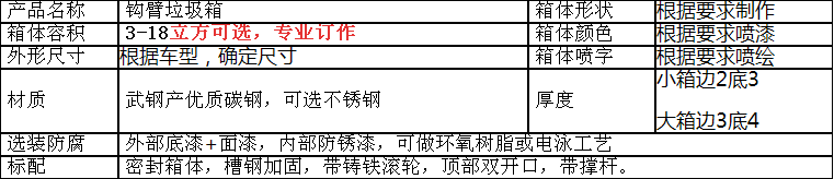 鉤臂垃圾箱與拉(鉤)臂式垃圾車配套使用,收集清運(yùn)生活垃圾的好幫手,方便快捷。鉤臂垃圾箱材質(zhì)分碳鋼鉤臂垃圾箱和不銹鋼鉤臂垃圾箱兩種;容積有:2.5立方,3立方,4立方,5立方,6立方,8立方,10立方,12立方,16立方,17立方,18立方,20立方垃圾箱,功能可分:帶壓縮功能要8立方以上的鉤臂垃圾箱和不帶壓縮功能的鉤臂垃圾箱。不同的垃圾箱體配不同的鉤臂式環(huán)衛(wèi)垃圾車。