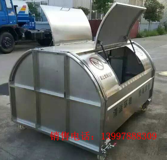 304不銹鋼,邊板:1.5mm,底板2mm,帶啟動(dòng)撐桿,尾部密封條鎖緊,4個(gè)萬向腳輪,2個(gè)滑道及鉤柄采用優(yōu)質(zhì)槽鋼,其他為不銹鋼。垃圾箱體外形尺寸1.94米長x1.4寬x0.98米高。