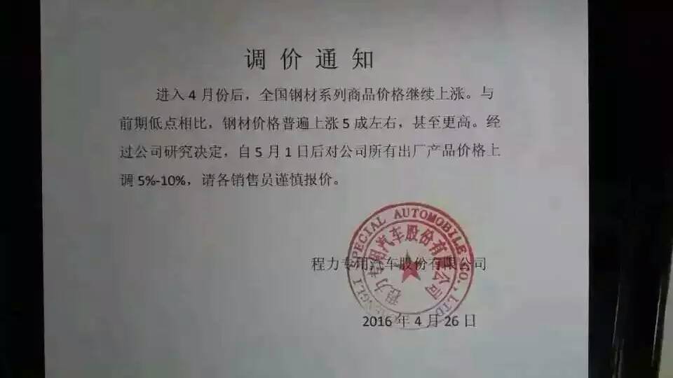 自5月1號過后,鋼材價格普遍上調價格,鋼材價格上調直接影響著汽車價格的上漲。湖北隨州程力專用汽車有限公司“慶五一,程力公司從廣大消費者的利益出發,暫且按出廠價賣出所有車型”還剩下不到一個星期,想訂車的朋友敢緊訂車,訂車電話:13997888309。