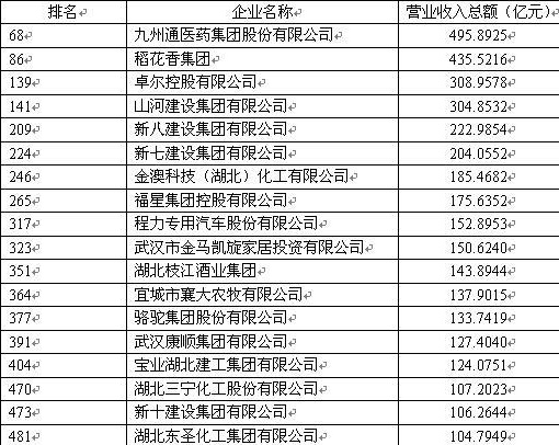 我省入圍的18家企業分別是:九州通(68位)、稻花香(86位)、卓爾控股(139位)、山河建設集團(141位)、新八建設集團(209位)、新七建設集團(224位)、金澳科技(246位)、福星集團(265位)、程力專汽(317位)、金馬凱旋(323位)、枝江酒業(351位)、襄大農牧(364位)、駱駝股份(377位)、康順集團(391位)、寶業湖北建工(404位)、三寧化工(470位)、新十建設集團(473位)、東圣化工(481位)。