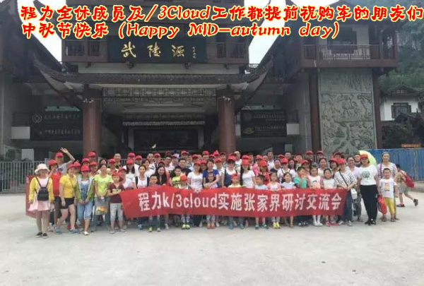 祝賀“程力公司在8月和即將來臨的中秋節(jié)喜獲大封收”——2016年8月26至28日,由程力集團公司總經(jīng)理程阿羅帶隊部分副總經(jīng)理及參加金蝶K/3cloud部分實施人員一行70余人赴張家界研討交流。同時,對于即將到來的中秋節(jié),程力全體員工及/3Cloud的成員提前祝大家各秋節(jié)快樂(Happy Mid/autumn day )