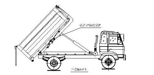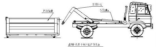 該車是由汽車底盤、拉臂主油缸、附車架、翻轉架、支撐腿(選裝)、鎖緊架、鎖緊油缸及多路換向閥等組成。翻轉架一端連在附車架上,其另一端設有活動拉臂,中間安裝有鎖緊系統;活動臂油缸一端連在活動臂上,另一端連接在附車架上;鎖緊機構通過鎖緊油缸的動作可以在箱體自卸時將附車架上的箱體與翻轉架及拉臂連為一體,在主油缸伸出時形成自卸角,也可以通過鎖緊油缸的收回把翻轉架與附車架鎖緊為一體,利用主油缸的收回或伸出使活動拉臂將地下的垃圾箱拖拉至附車架上或從附車架上放回到地面。