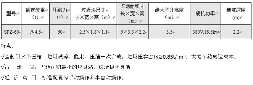 水平式垃圾壓縮站由壓縮箱體、壓縮推板、舉升機構(gòu)、電液控制系統(tǒng)、污水排放系統(tǒng)等組成,采用機、電、液一體化技術(shù),具有手動及PLC自動控制功能,可實現(xiàn)安全報警等。該系列垃圾站體容積為6-12立方,壓縮力為50-80噸,日處理量30-60噸。它廣泛應(yīng)用于城鎮(zhèn)居民生活區(qū)、工業(yè)區(qū)、商業(yè)區(qū)、大型樓盤住宅區(qū)、學(xué)校、機關(guān)、公園、風(fēng)景區(qū)等場所.銷售電話:13997888309 網(wǎng)址:www.www.qufubbs.cn