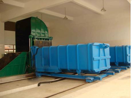 將垃圾倒入壓縮機的提料斗內,利用壓縮機的推料裝置將垃圾推入水平放置的箱體內(箱體一般為長方體集裝箱),推料裝置可不斷地向箱體內壓垃圾,直到箱體壓滿為止,然后由車廂可卸式垃圾車(拉臂車)將箱體運到填埋場或焚燒場,