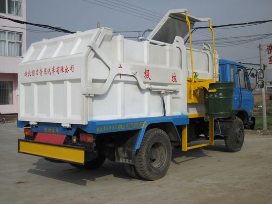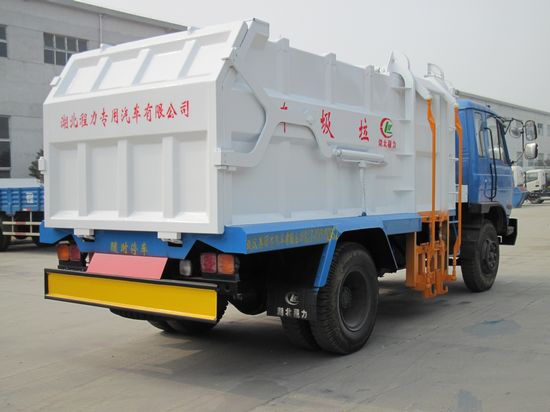 湖北程力生產(chǎn)的壓縮帶掛桶式垃圾車(chē)側(cè)面整車(chē)照片(側(cè)面是掛桶鉤)