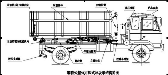 一、環衛垃圾車程車箱可卸(拉臂)式垃圾車(套臂式)使用說明書結構簡圖